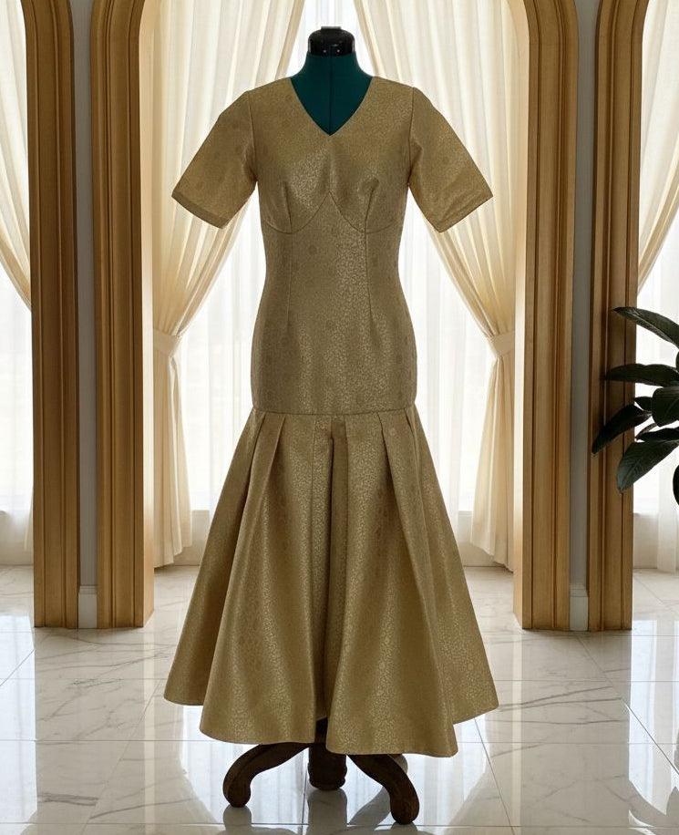 A stunning golden Banaras sharara style dress with a fitted bodice, V neckline, and short sleeves. The flared silhouette below the knee forms a voluminous pleated hemline, creating a regal festive look.