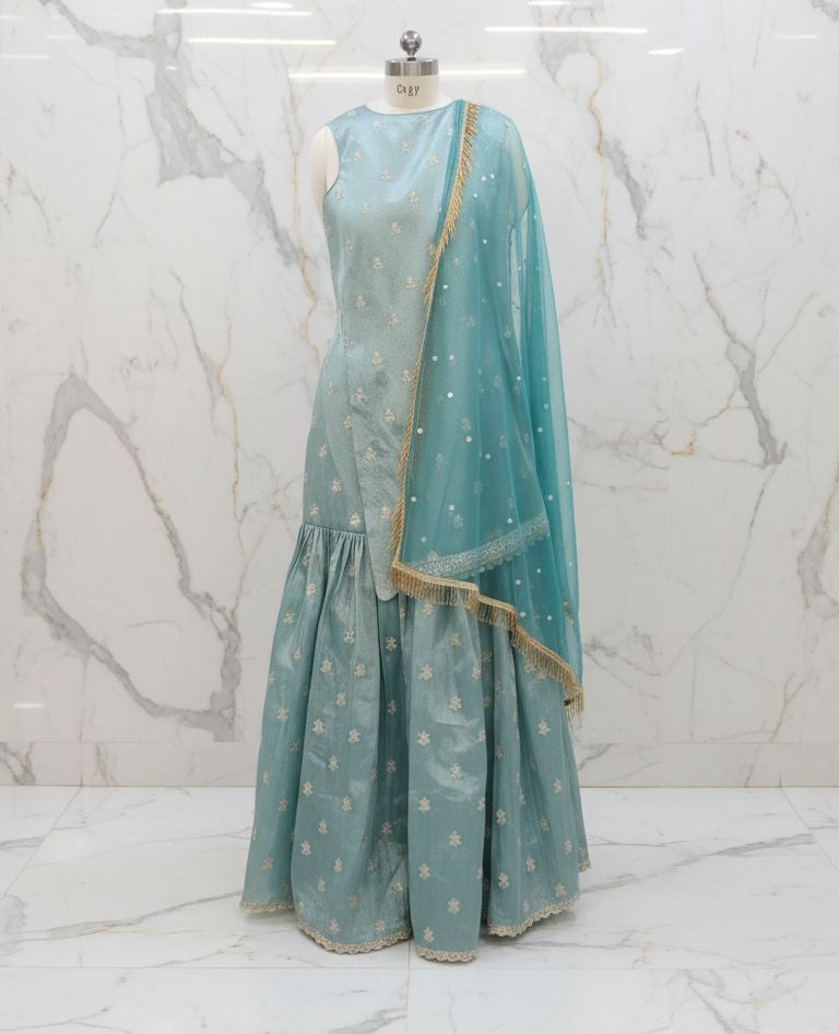 A classic sea green gharara suit made from raw silk, featuring fitted trousers till the knee that flare dramatically with a gathered seam. Finished with metallic gold embellishments for a timeless traditional appeal.