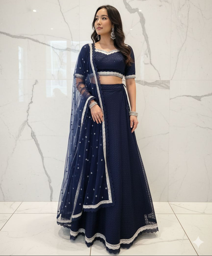 An elegant navy blue lehenga choli featuring scattered silver detailing and a bold statement border. Paired with a matching dupatta, this ensemble is perfect for weddings and festive celebrations.