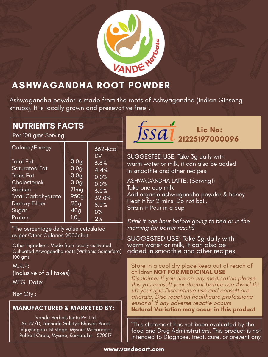 Ashwagandha Root Powder 100 gm| Vande Herbals