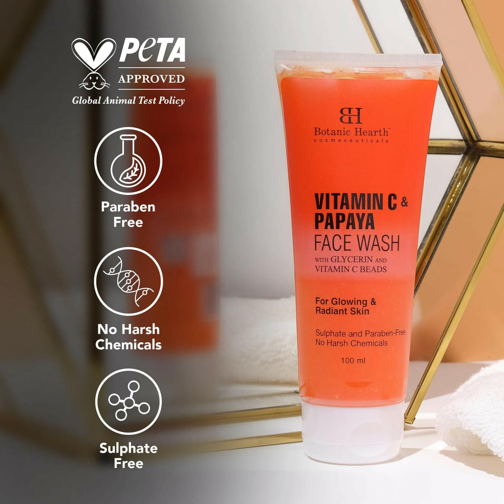 Paraphrase: Botanic Hearth Vitamin C & Papaya Cleanser Face Wash For Glowing & Radiant Skin About the Product: Adds Glow & Radiance: Botanic Hearth Vitamin C and Papaya Face Wash for women and men helps effectively brighten dull skin and revitalise complexion for a radiant glow Promotes Even Skin Tone: The Vitamin C Face Wash for glowing skin deeply cleanses and eliminates dirt, dirt, and excess oil for an even-toned skin Contains Anti