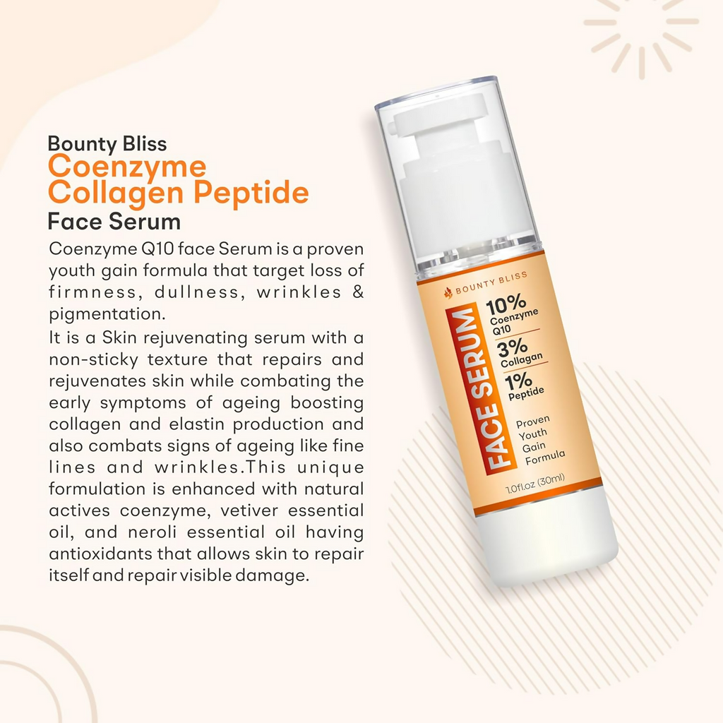 phrase: Paraphrase: Bounty Bliss Coenzyme Collagen Peptide Face Serum About the Product: Collagen Boosting: Collagen is a crucial protein that provides structure and elasticity to the skin. As we age, collagen production naturally declines, leading to wrinkles and sagging skin. Coenzyme Q10 and collagen peptides in Bounty Bliss Coenzyme Collagen Peptide Face Serum help stimulate collagen production