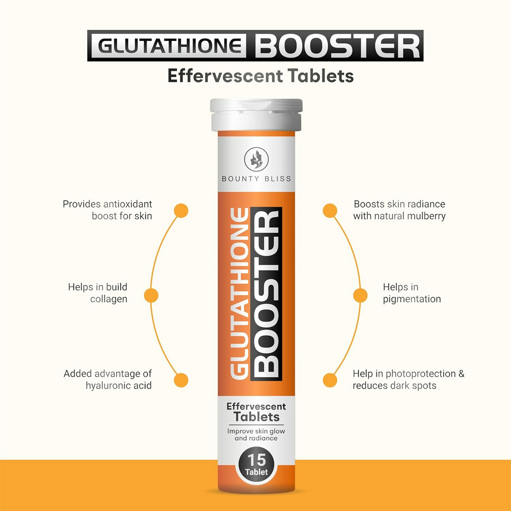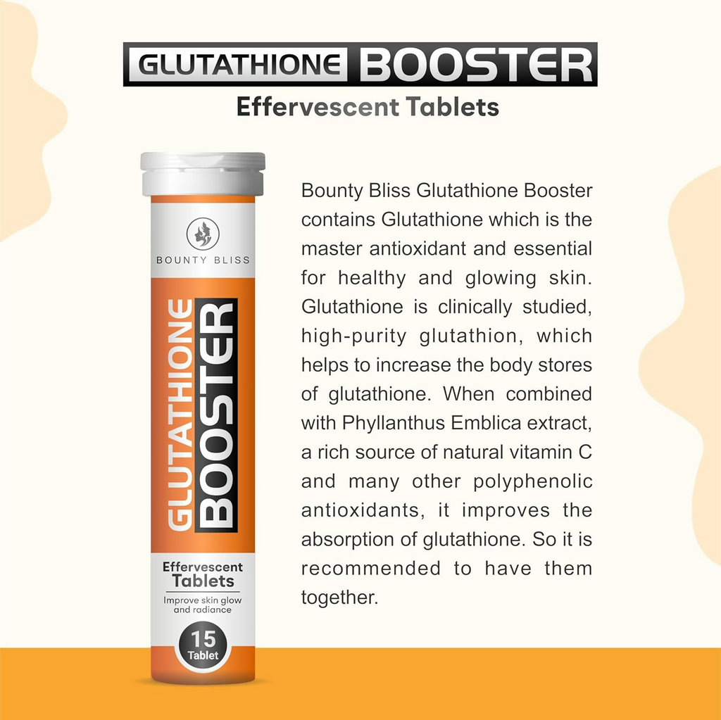 phrase:: Bounty Bliss Glutathione Booster Effervescent Tablets About the Product: Boosts Glutathione Levels: Glutathione is a crucial antioxidant produced naturally in the body. its levels decrease due to various factors such as aging, stress, and pollution. These effervescent tablets provide convenient way to boost glutathione levels in the body, Helping overall health and well-being.