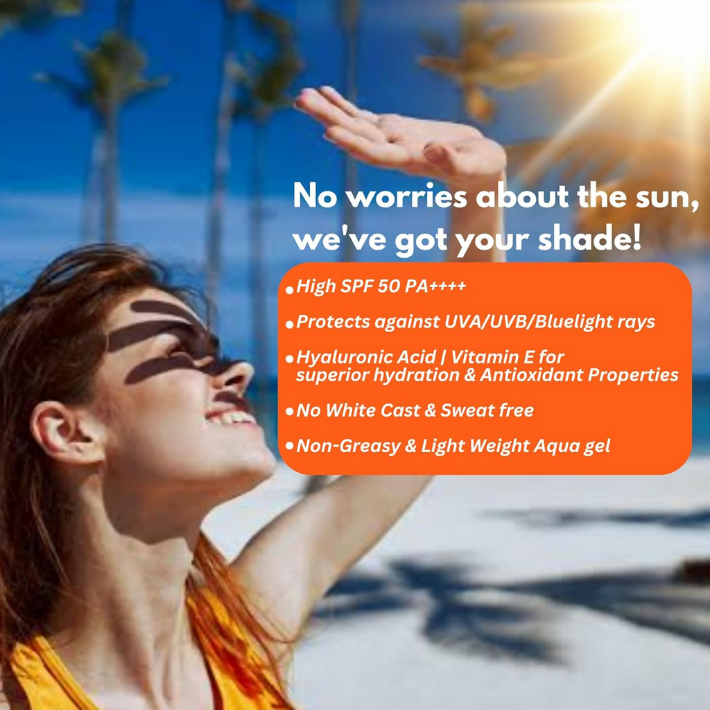 phrase: BrownSugar Hyaluronic Glow+ Sunscreen Paraphrase: Brownsugar Hyaluronic Glow+ Sunscreen About the product : Protects From UV Rays and Blue Light : The sunscreen offers high level of protection with SPF 50 and PA++++. It contains Titanium Dioxide and Zinc Oxide, which are physical blockers that create a barrier on the skin to shield against harmful UV rays.