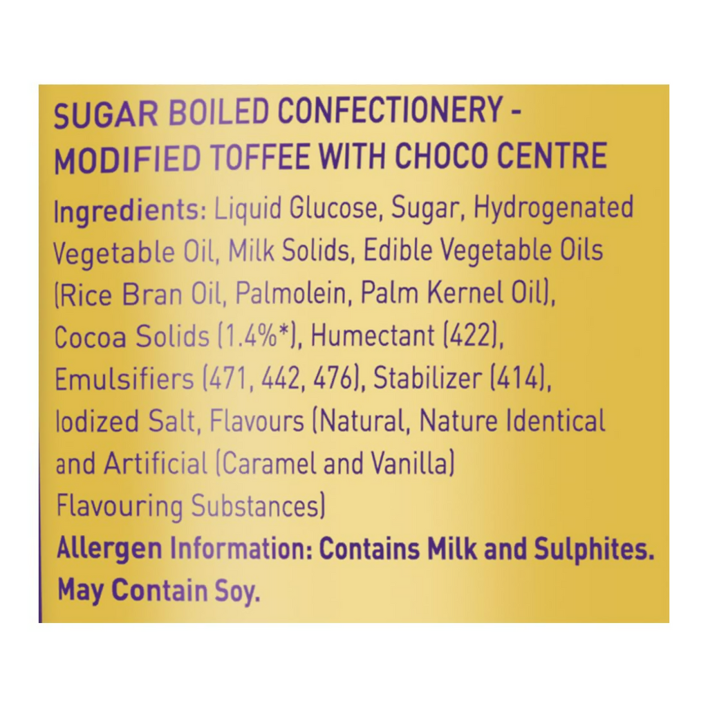 Paraphrase: Cadbury Choclairs Gold Candies (Chocolatecaramel) About the Product: This pack comes with 100 Cadbury Choclairs Gold candies. Ingredients: Liquid Glucose, Sugar, Hydrogenated Vegetable Oil, Milk Solids, Edible Vegetable Oils (Rice Bran Oil, Palmolein, Palm Kernel Oil), Cocoa Solids Legal Disclaimer: Product images are for information purposes only. Images/packaging/ labels may vary from time