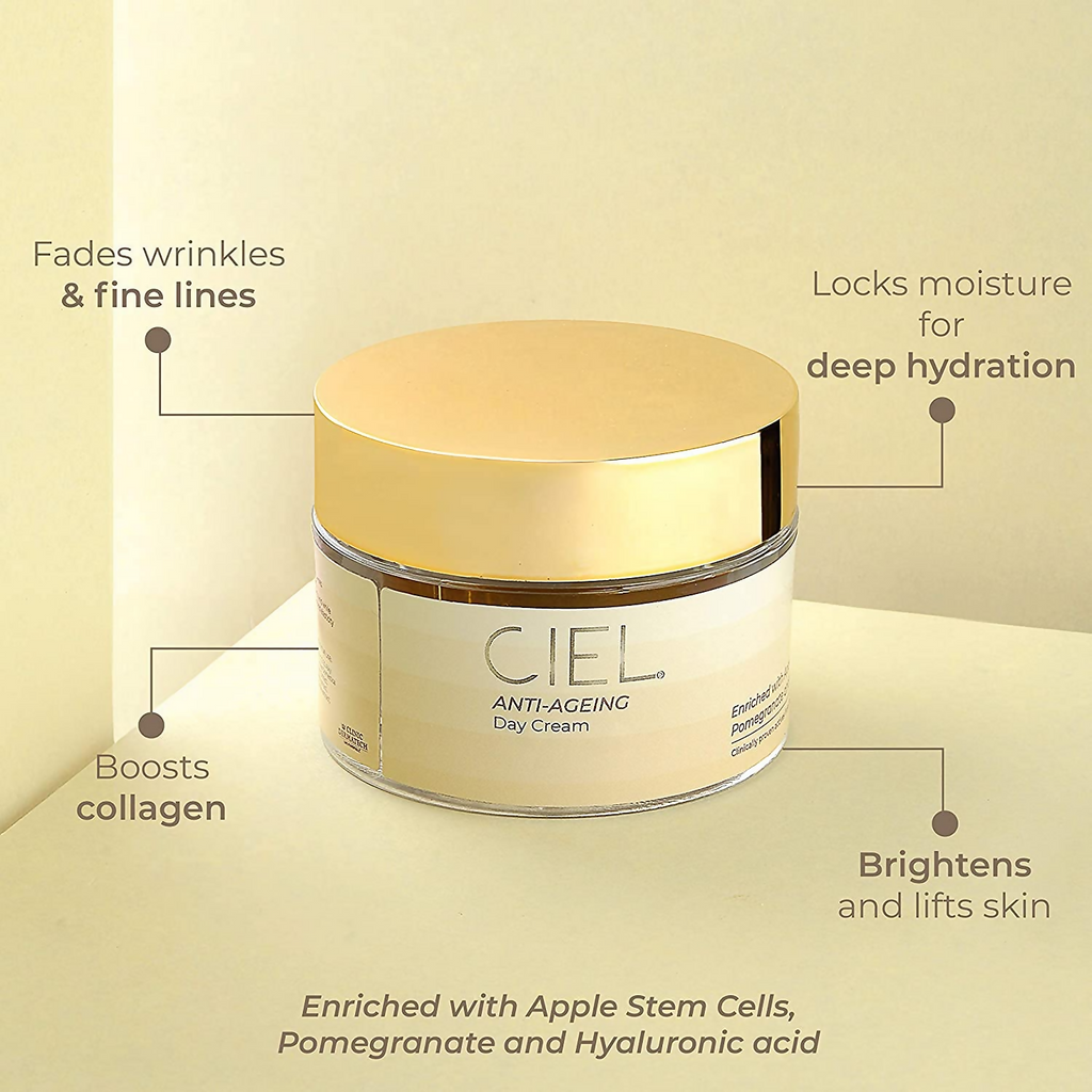 Paraphrase: Ciel Anti-Ageing Day Cream For Glowing Skin Moisturizer With Vitamin C & Hyaluronic Acid About The Product: CIEL Anti-Ageing Day Cream is a deep nourishing formula that reduce wrinkles and dark spots. Through the day, it provides essential moisture that replenishes and plumps dry, slackening skin. Skin looks visibly smoother, lifted, and radiant. How to use: Take an adequate amount and apply on the face and neck during the