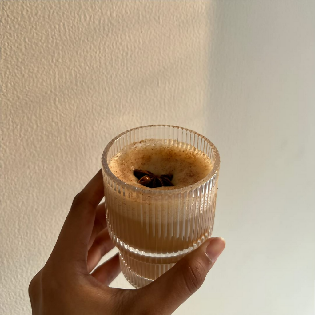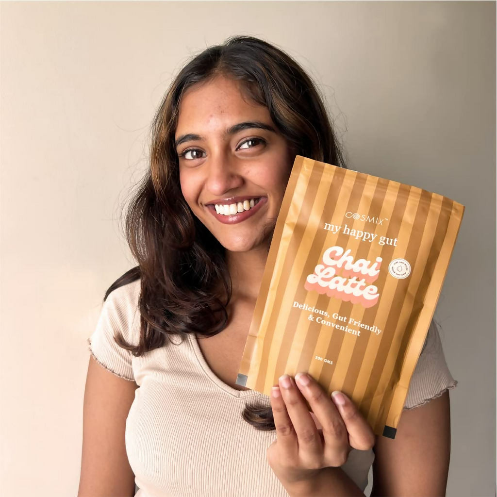 Paraphrase: Cosmix My Happy Gut Chai Latte Ingredients: Coconut Milk Powder Blend, Cardamom Tea, Ginger, Fermented Papaya, Triphala, Mulethi, Ashoka, Jeera, Monk Fruit. Legal Disclaimer: Product images are for illustrative purposes only. Images/packaging/ labels may vary from time to time due to changes made by the manufacturer's manufacturing batch and location. The product description is for information purposes only and may contain additional ingredients.