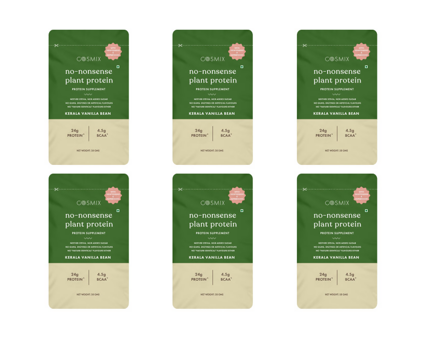 phrase: Cosmix No Nonsense Plant Protein Kerala Vanilla Bean About the Product: The cleanest & the most gut-friendly No-Nonsense Plant Protein is here to meet your daily protein goals! Packed with 24g of complete plant protein per serve, it helps you with muscle growth, muscle recovery, sustained energy, increase satiety and curb cravings.