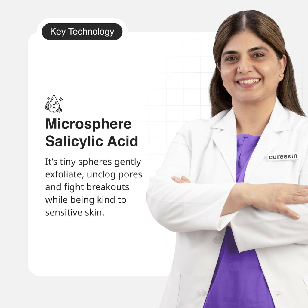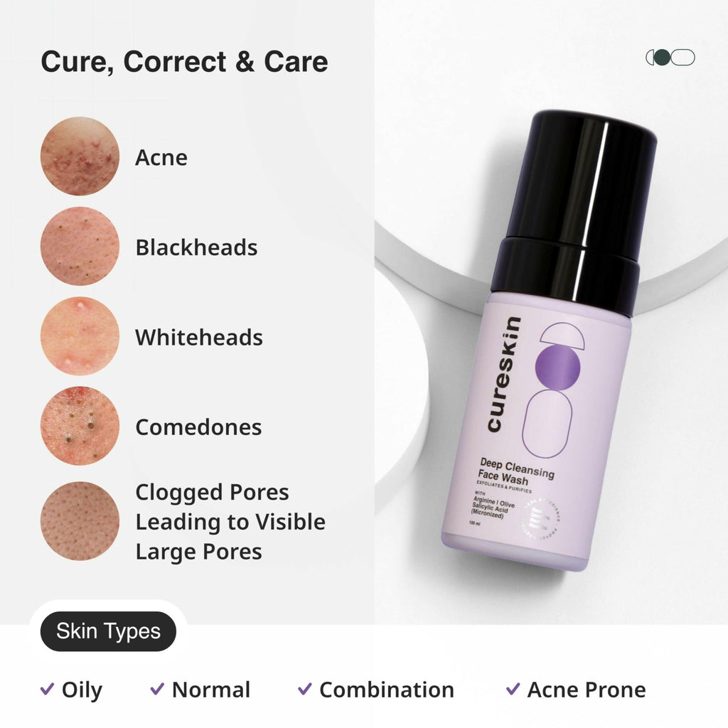 phrase: Cureskin Deep Cleanse Salicylic Acid Face Wash for Oily Skin About the Product: Deep Cleanse & Unclog Pores: Microsphere Salicylic Acid gently exfoliates, removes dirt & impurities, and fights breakouts without irritation. Collagen Boost: Stimulates collagen production for firmer, plumper skin with youthful glow. Targets Acne & Blemishes: Effectively combats acne, blackheads, whitehead