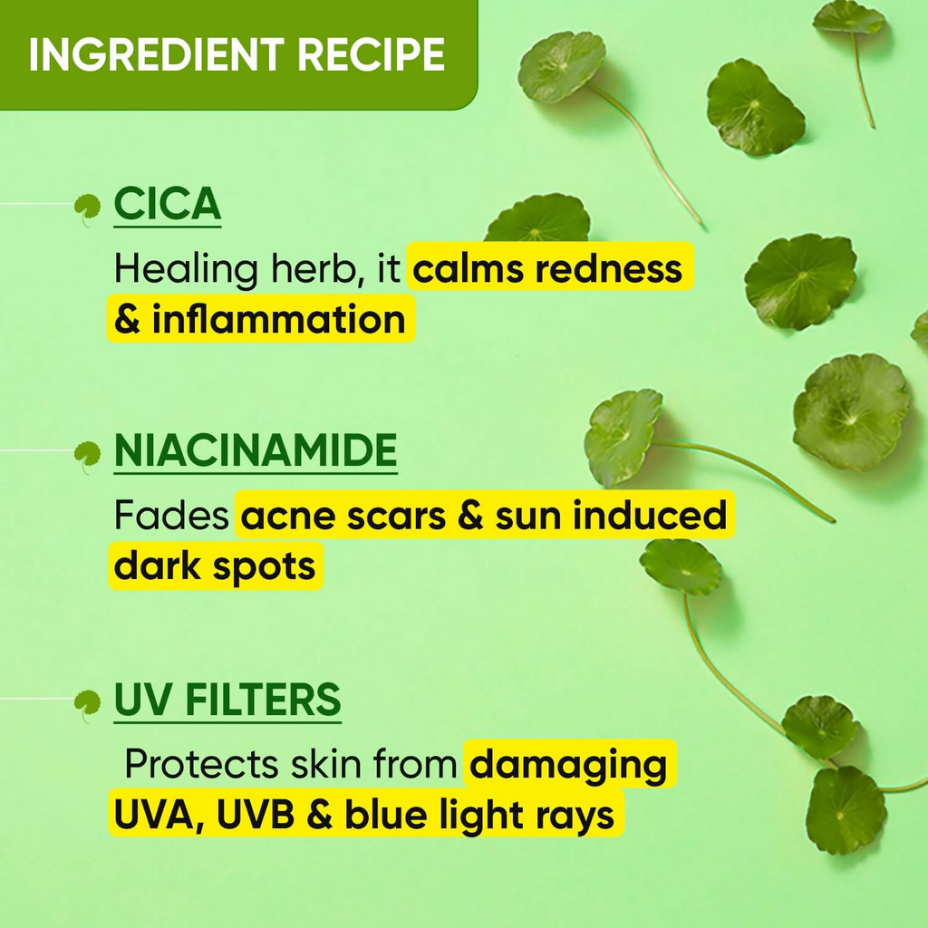 phrase: Dot & Key CICA Calming Mattifying Sunscreen SPF 50 For Oily Acne Prone & Sensitive Skin About the Product: Calms & soothes sun-exposed skin Fades sun spots Prevents uneven skin tone & pigmentation Reverses photodamage to prevent aging from sun exposure Reverses photodamage to prevent aging from sun exposure Reapply as required Suitable for use under makeup too Legal Disclaimer: Product images are for information purposes