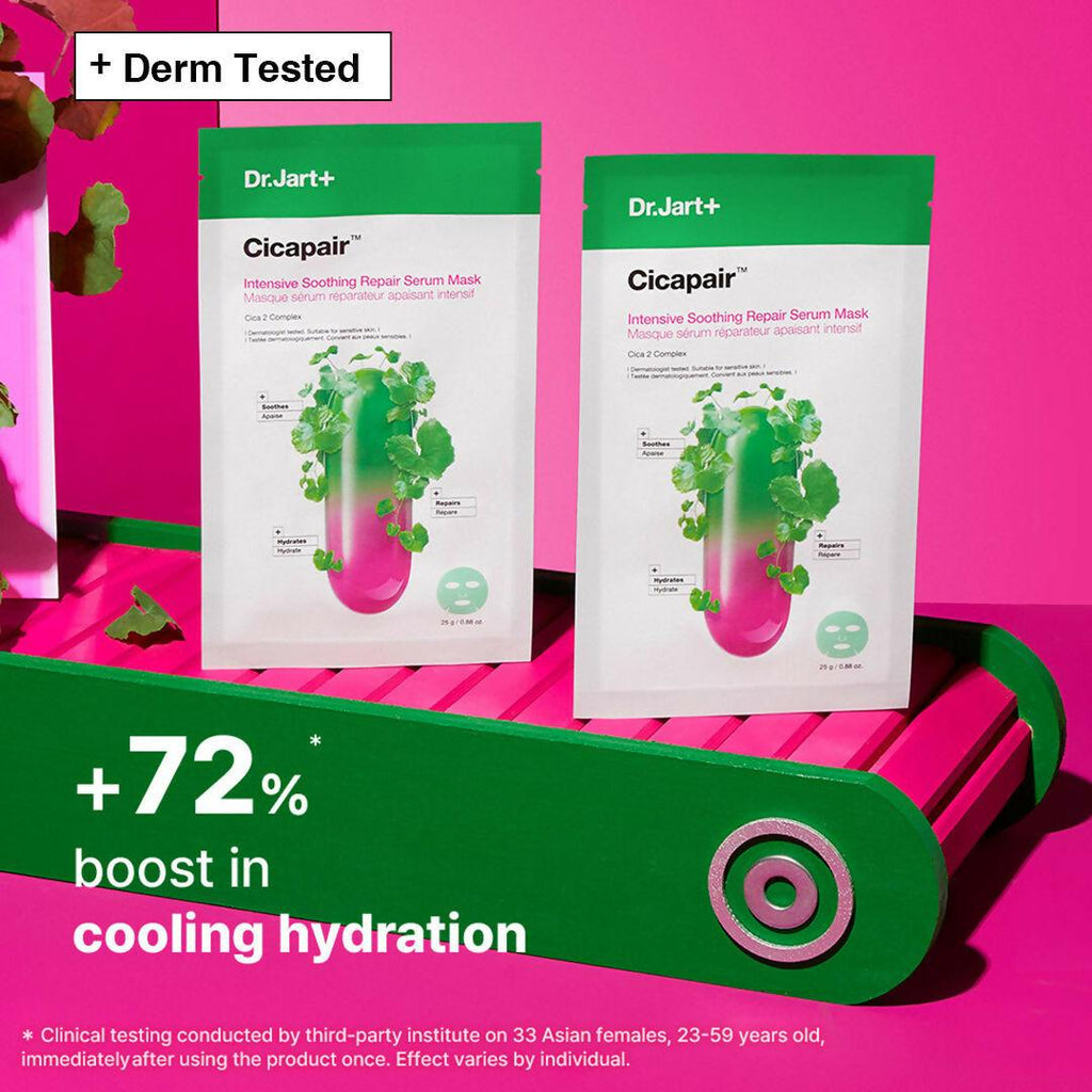 phrase: Dr.Jart+ Cicapair Intensive Soothing Repair Serum Mask for Hydration & Suitable for Sensitive Skin About the Product: Intensive soothing treatment at your fingertips. This cooling face mask is infused with a serum-y liquid that contains cica complex (centella asiatica extracts) and allantoin. How to Use: Unfold mask, place onto clean skin, and leave on for 15-20 minutes. Remove mask and gently pat remaining serum into skin Legal Disclaimer