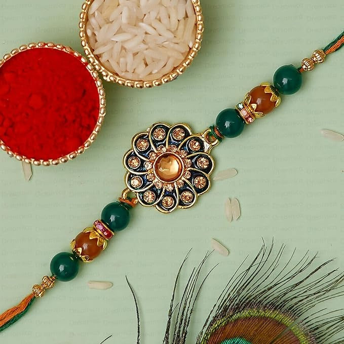 Dreamica Mens Rakhi Gift for Brother, Rakhi with Lord Ganesha Idol Combo Set | Best Rakhi for Brother | Pack of 8 (5 Rakhi, 1 Ganesh Idol, 1 Greeting Card, 1 Roli Chawal Pack,Gn-28)