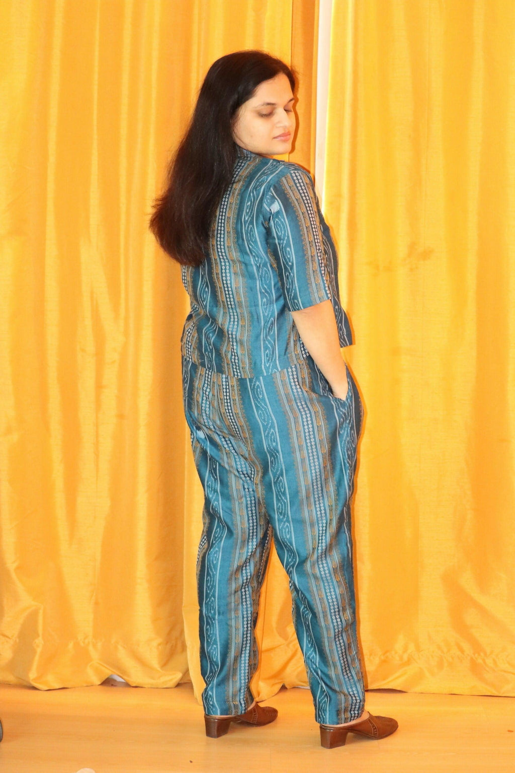 phrase: Earthyweaves Meghika Sambalpuri Co-ord Set Introducing the "Meghika" Sambalpuri Co-ord Set. This knee-length set ensures a comfortable and lightweight fit for any occasion. Embrace the essence of traditional craftsmanship in a modern silhouette.