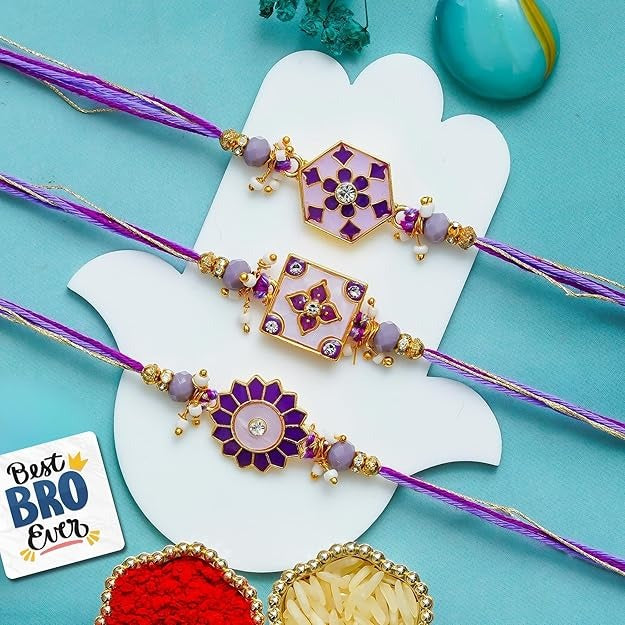 eCraftIndia Set of 3 Purple Floral Designer Rakhis | Best Bro Ever Fridge Magnet | Roli Chawal Pack | Rakhi for Brother