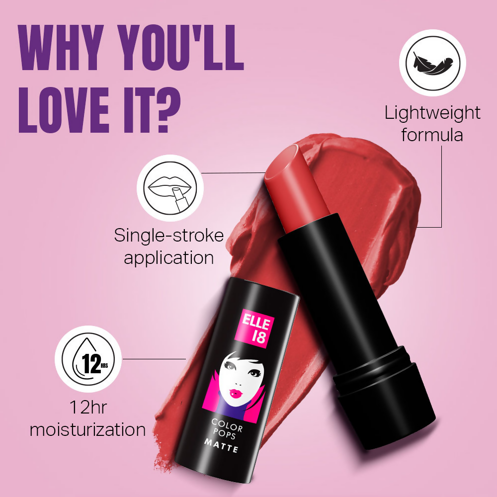 Paraphrase: Elle 18 Color Pop Matte Lip Color - R36 Maroon City Ingredients: vitamin E, almond oil How To Use: Apply by starting in the centre of your upper lip. Work from the centre to the outer edges of your lip following the contours of your mouth. Then glide across the entire bottom lip. Legal Disclaimer: Product images are for illustrative purposes only. Images/packaging/ labels may vary from time to time due to changes made by the manufacturer's manufacturing batch and location.
