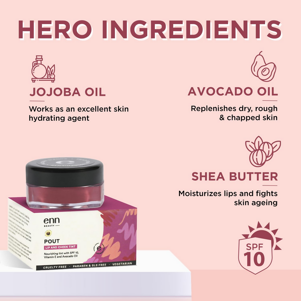 phrase: Enn Beauty Pout Lip, Cheek Tint With SPF 10 With Jojoba & Avocado Oil - Bare Blush About The Product: 2-in-1 Beauty Essential: Pout is a versatile lip and cheek tint that adds vibrant Nude color to your lips. It's lightweight, user-friendly, and perfect for an effortlessly dazzling appearance on the go.