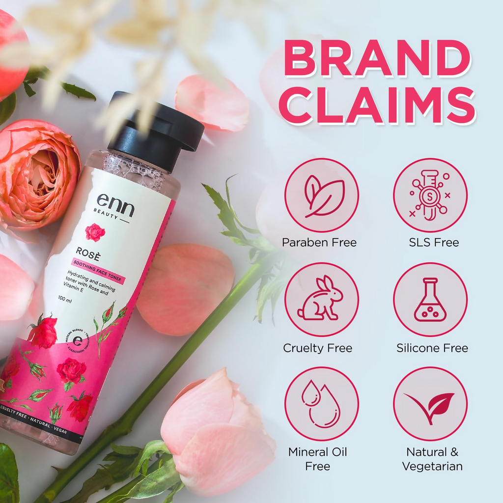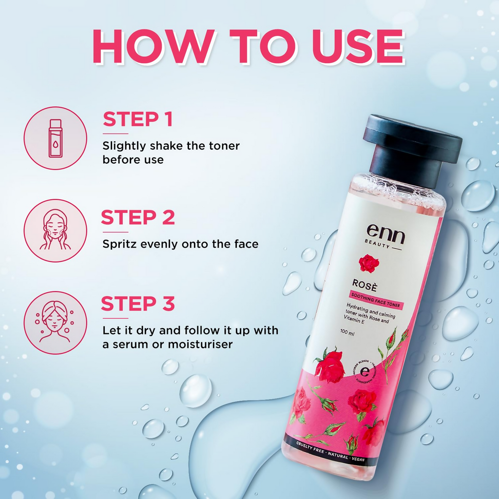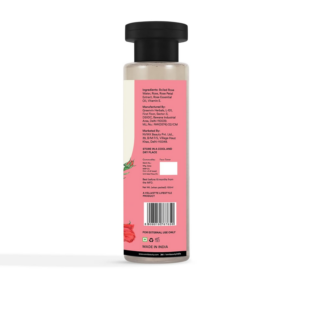 phrase: Enn Rose Water Soothing Face Toner With Natural Rose & Vitamin E For Pore Tightening About The Product: Revitalized Complexion: The Rose Soothing Face Toner is enriched with Rose Petal Extract, Rose Essential Oil, and Vitamin E.