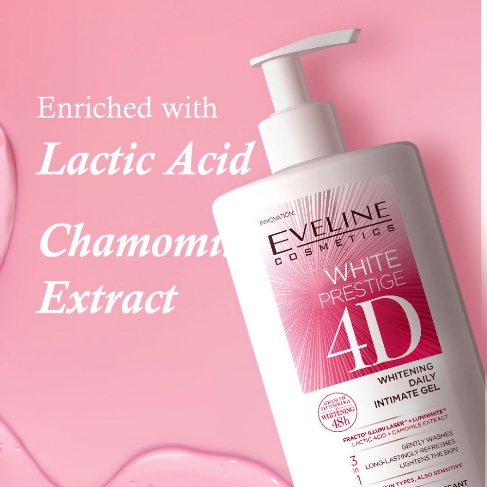 Paraphrase: Eveline Cosmetics White Prestige 4D Whitening Daily Intimate Gel About The Product: Formula based on FRACTO ILLUMI LASER cutting-edge technology, using concentrated power like laser beam. Lumiwhite Complex breaks down the melanin accumulated at the place of the discoloration into finer molecules, which are then automatically absorbed. How to use: Use a small amount to wash the intimate parts of the body, then rinse with water.