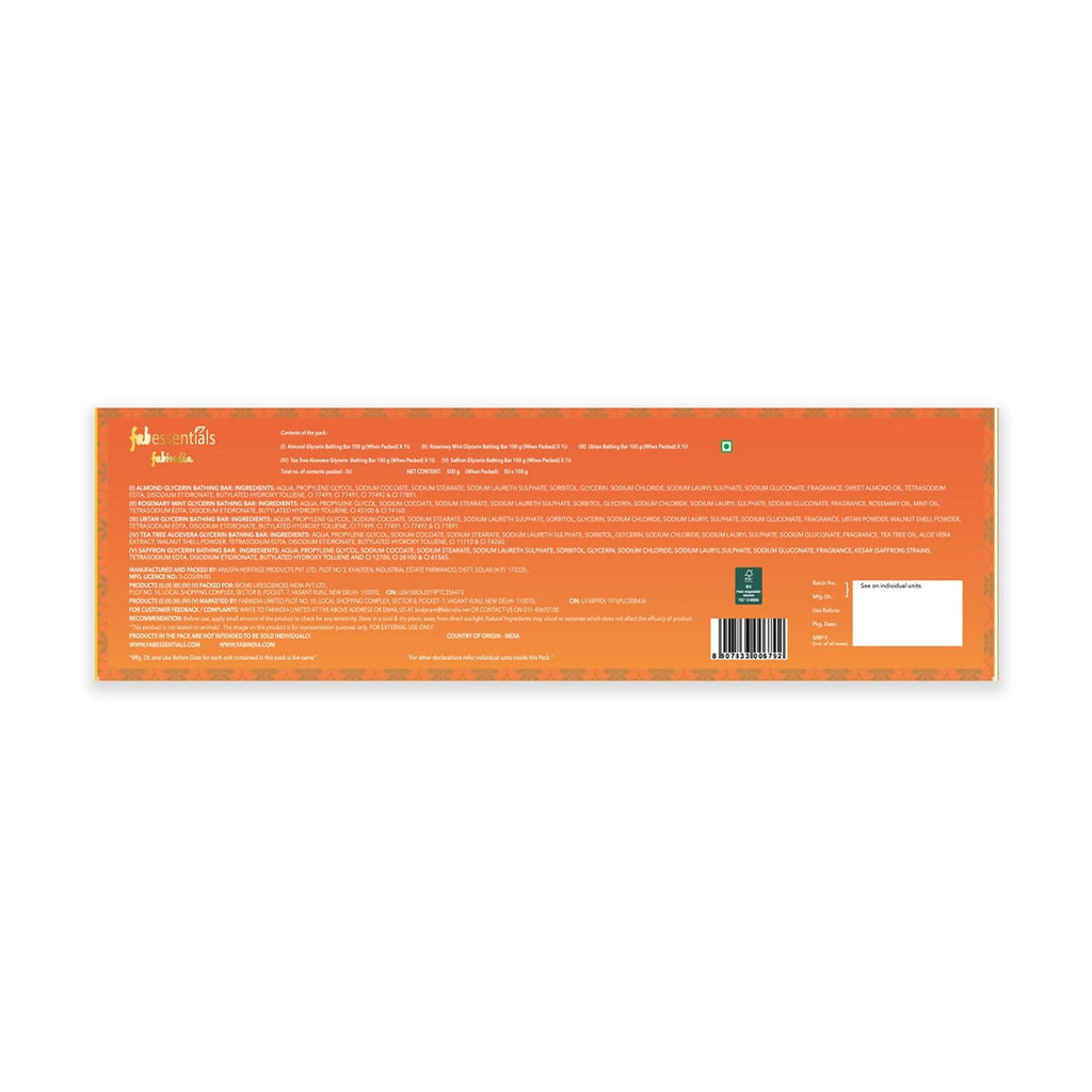Paraphrase: Fabessentials Botanical Assorted Bathing Bars Combo This Combo Contents is: Almond Glycerin Bathing Bar: Fabessentials Jasmine Patchouli Body Spray, brings a fresh burst of blooming Orange Blossoms, followed by a comforting blend of Litchi, Black Currant, and Bergamot. Tea Tree Aloe vera Glycerin Bathing Bar: 100 gm About the Product: Fa