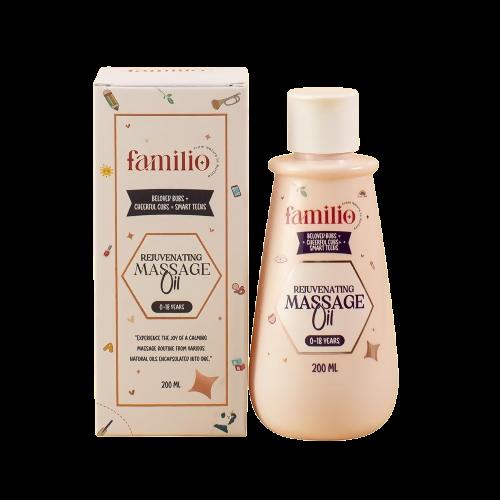 Paraphrase: Familio Rejuventing Massage Oil About the product : "Experience the joy of a calming massage routine from various natural oils encapsulated into one" lt is designed to provide soothing comfort and nourishment to skin. It is created with various natural oils keeping it free from harsh chemicals.