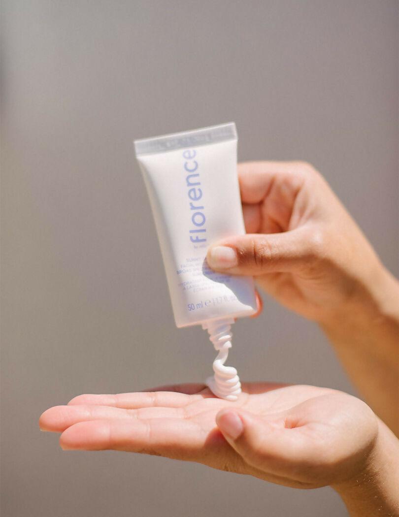 Paraphrase: Florence by Mills Sunny Skies Facial Moisturizer Broad Spectrum SPF 30 Sunscreen About the Product: Skies the limit with this reef-safe* mineral SPF 30 broad spectrum sunscreen facial moisturizer. Lightweight and non-greasy, it is made with vitamin E to condition skin and dries down to a smooth finish without leaving a white cast.