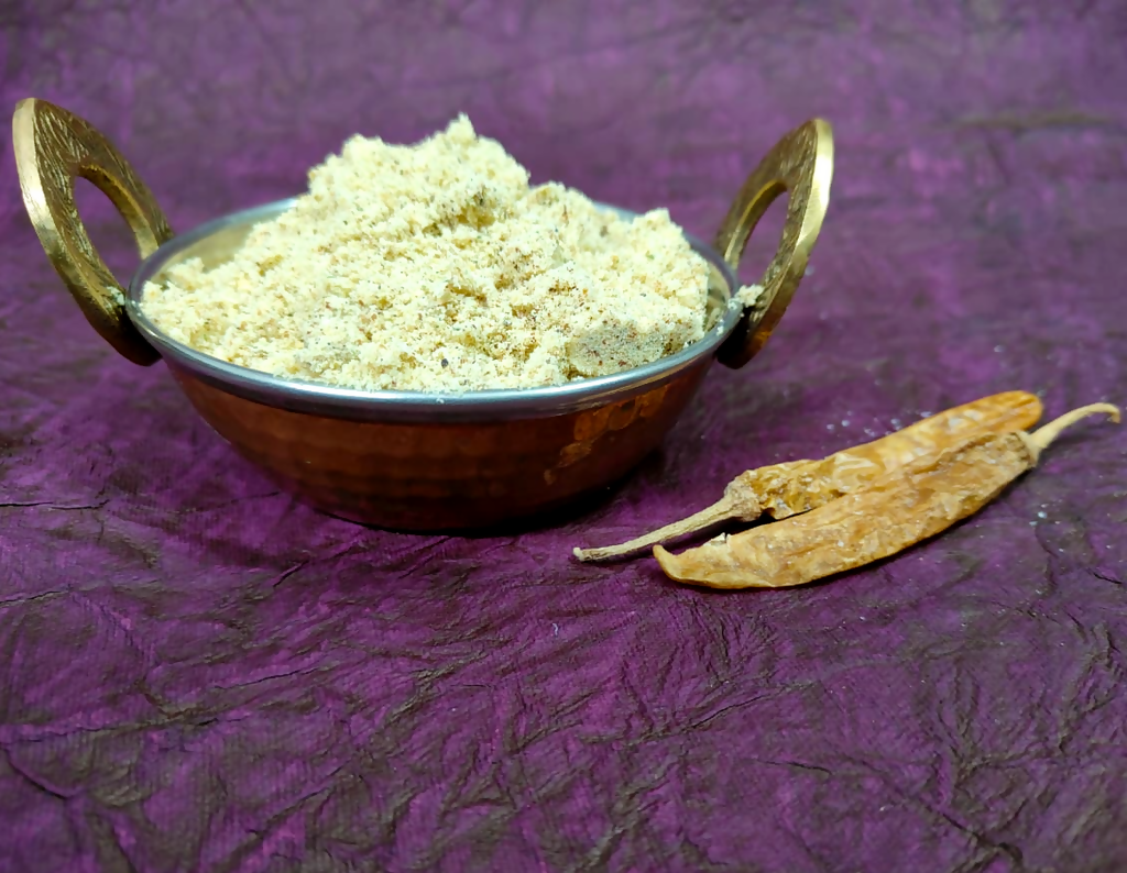 About the Product:- Challa Mirapa Podi is a famous and spicy chili powder condiment used in Andhra cuisine. It is made with roasted curd chilies and other ingredients like, bengalgram, garlic, cumin seeds, and salt, which are then ground into a fine powder. Challa Mirapa Podi is known for its fiery taste and is often sprinkled on rice, dosas, and idlis, or used as a seasoning in various dishes to add heat and flavor.
