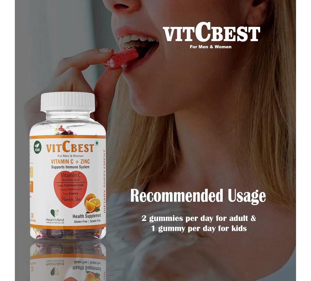 Paraphrase: HealthBest VitCbest Vitamin C + Zinc Gummies About the product: ADVANCED & CONVENIENT: Well researched formulation of Vitamin C with Zinc in gummies form to boost your Vitamin C intake while on the go with amazing orange flavor NATURAL ANTIOXIDANT: Vitamin C a potent antioxidant and essential nutrient that our body needs. How to use: As suggested by the expert.