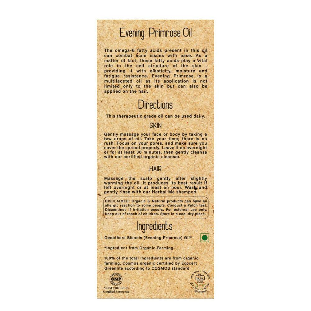 : Herbal Me Cold Pressed Evening Primrose Hair Oil About the Product: Herbal Me Evening Primrose Oil is a multifaceted oil for both, face and hair. The omega-6 fatty acids present in this oil can combat acne issues with ease. this oil helps with premenstrual syndrome (PMS) when it comes to irritability and bloating.