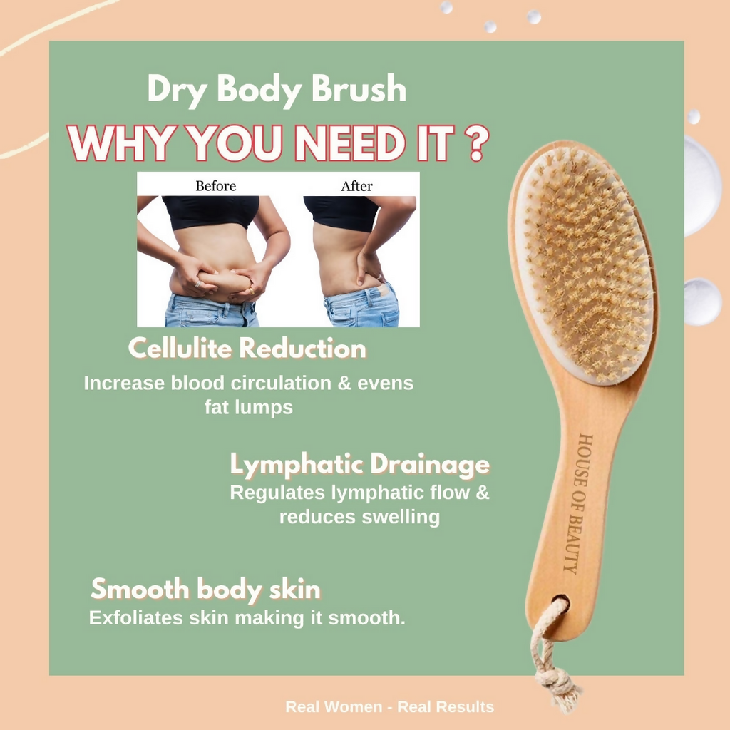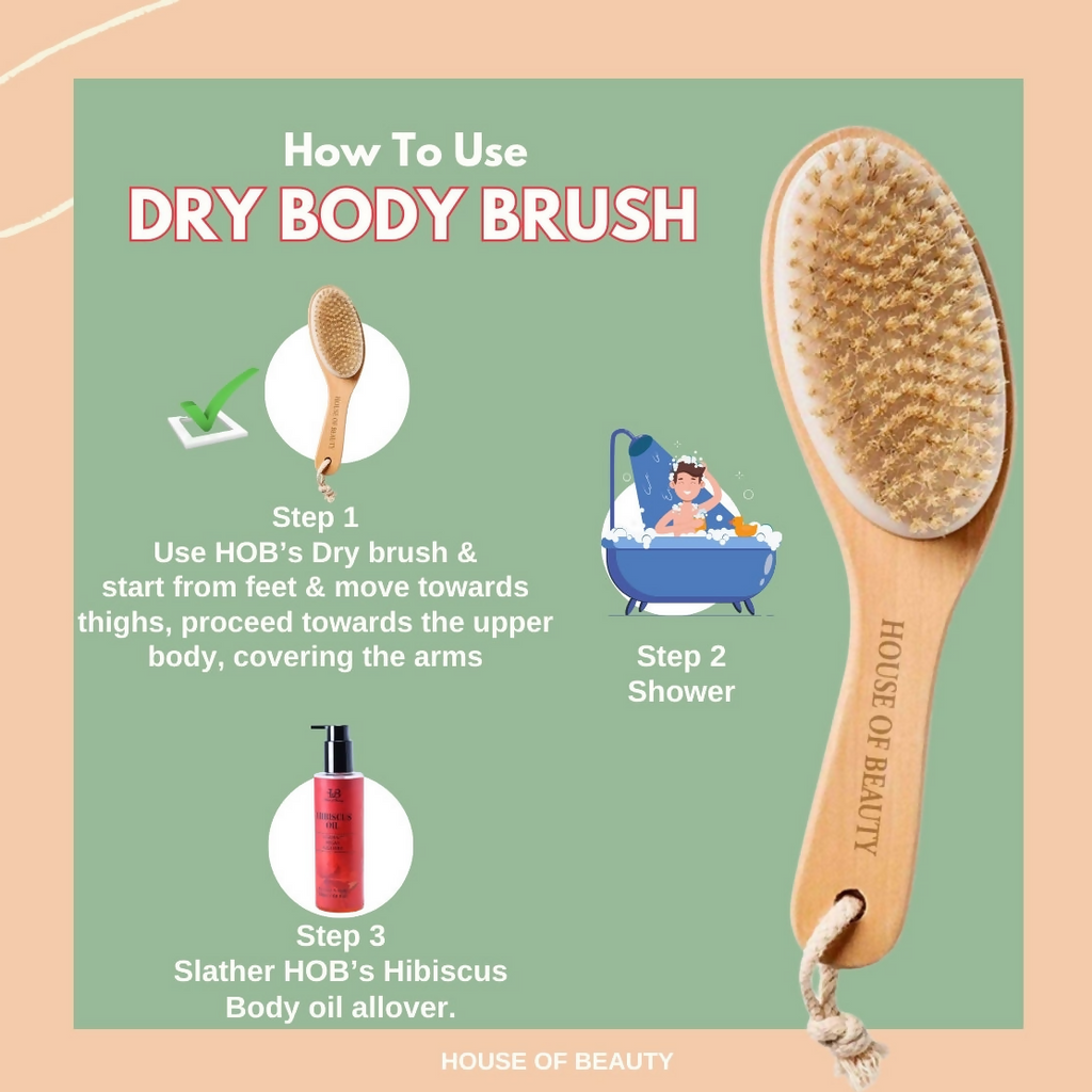 Paraphrase: House of Beauty Dry Brush How To Use : Must be used on dry skin before your shower. Start with your face then body. Start from your feet upwards, move from knee to thigh in an upward direction. Use medium to firm strokes, daily, preferably in the morning. Take a shower after dry brushing immediately, hydration is key!