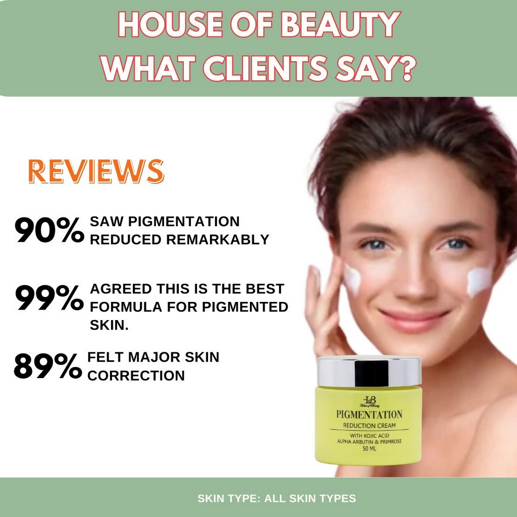 Paraphrase: House of Beauty Pigmentation Reduction Cream Ingredients: Collagen, Aloe Vera Extract, Hyaluronic Acid, Rosehip Oil, Avocado Oil, Coconut Oil, Cetyl Alcohol, Vitamin C, Green Tea Extract, Licorice Extract, Chamomile Extract, Lactic Acid, Orange Peel Extract, Bakuchiol, Pomegranate Oil, Vitamin E. How To Use : Cleanse your face thoroughly before application. Use HOB Pigmentation serum as step 1 of this routine