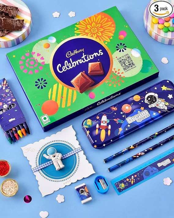 • Rakhi Gift Pack Contains: Celebrations Chocolate Box, Stationery Box, Kids Rakhi and Roli & Rice.