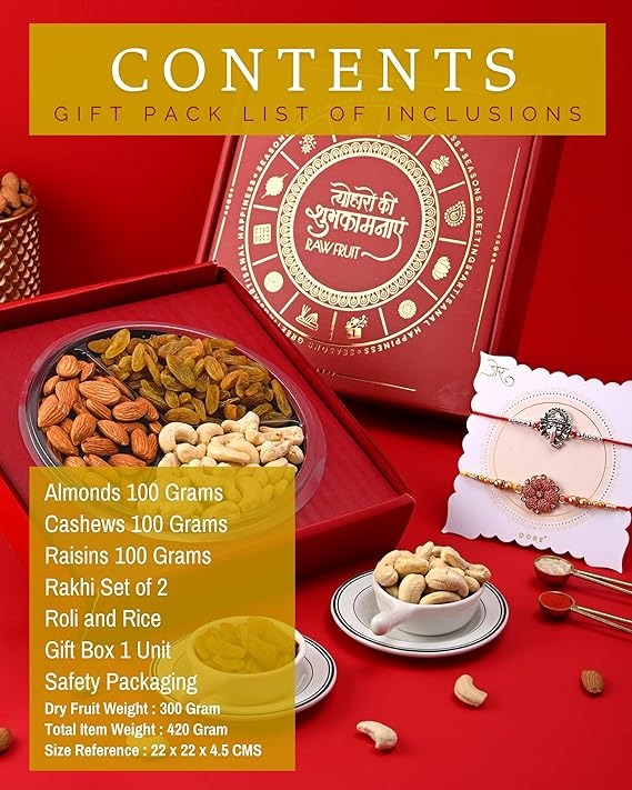 • Rakhi Dry Fruits Gift Box Contains: Cashews 100g, Almonds 100g, Raisins 100g & Lambodar Priya Rakhi Set of 2 with Roli and Rice.