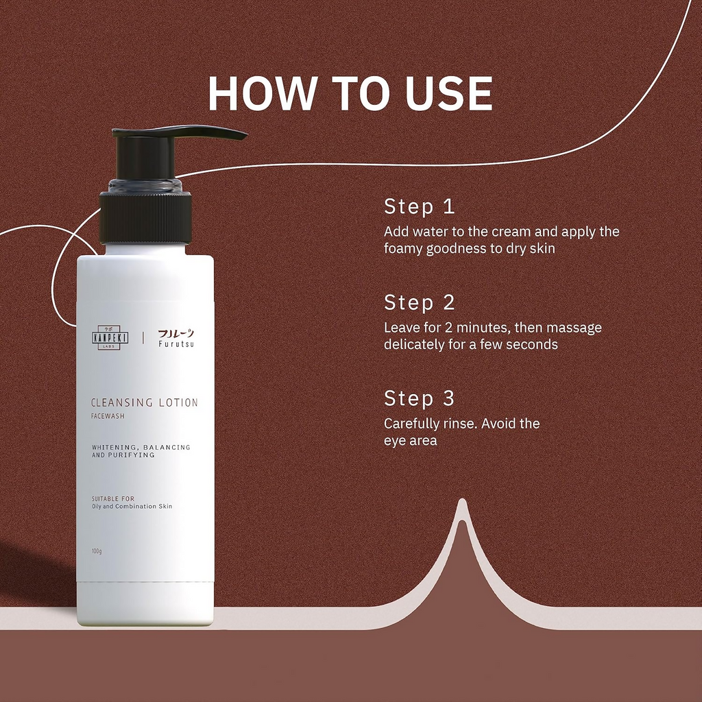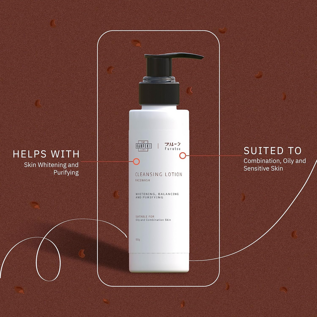 phrase: Kanpeki Labs Furutsu Cleansing Lotion Face Wash About the product: Cleanse your skin off impurities and makeup, restoring the skin’s equilibrium and luminosity with a gentle creamy foam cleanser. Gently lift impurities off the skin with a soft foam cream. With lipidic affinity, the creamy milk removes makeup, pollution and excess sebum, leaving the skin perfectly clean and glowing.