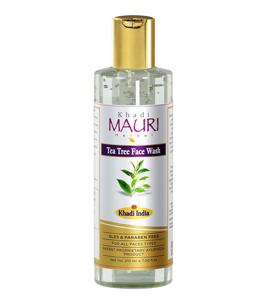 phrase: Khadi Mauri Herbal Tea Tree Face Wash About the product : Nothing can calm your stressed skin after a long day better than a touch of Tea Tree oil! Tea Tree Face Wash helps fight acne and dark spots on the face. It cleanses the skin deeply and provides nourishment. Use the Tea Tree Face Wash regularly for overall skin rejuvenation. Ingredients : Red Sandal, Tea Tree Oil, Aloe Vera Gel, Basil Leaf.