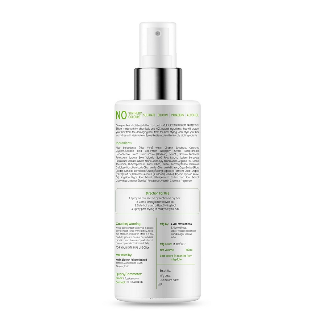 Paraphrase: Ktein 100% plant based natural hair heat protection spray. Ktein 100% plant based natural hair heat protection spray provides heat protection to hair cortex and cuticles while reducing hair breakage.