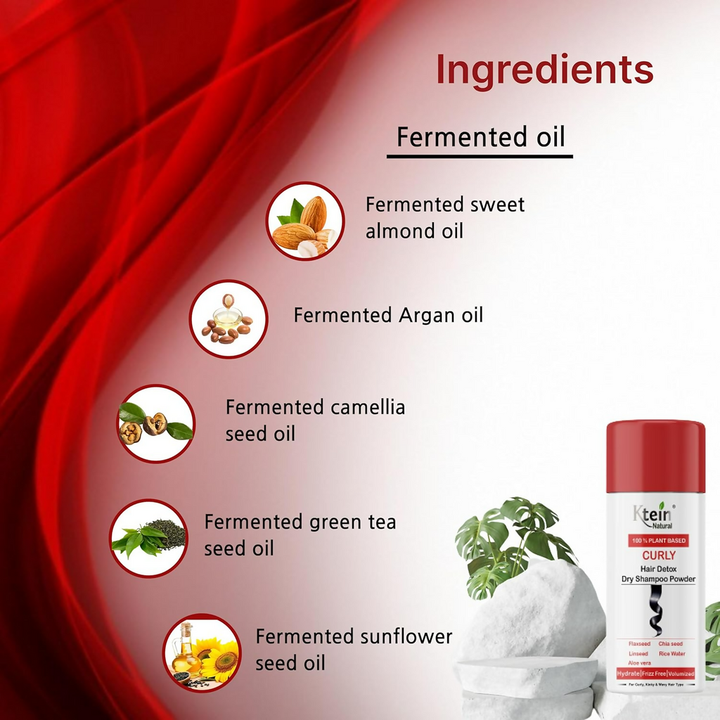 : Ktein Natural 100% Plant-Based Hair Detox Dry Shampoo About the Product: BRING YOUR CURLS TO LIFE: Unleash the vibrant beauty of your curls with our new curly hair dry shampoo. Embrace defined, bouncy curls that turn heads wherever you go with our new curly hair dry shampoo. Ingredients: Flaxseed, Chia seed & Linseed, Fermented Argan oil, Fermented camellia seed oil, Fermented green tea seed oil, Fer