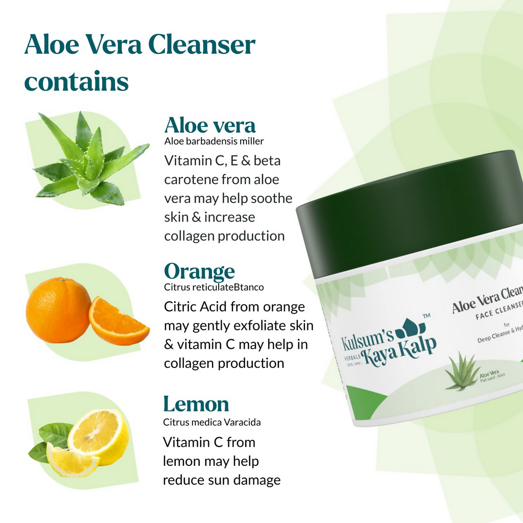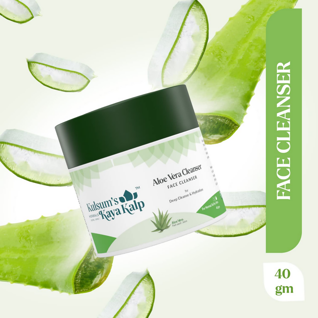 : Kulsum's Kaya Kalp Aloe Vera Cleanser For Deep Cleanse & Hydration About The Product: Deeply cleanses & rejuvenates the skin Hydrates the skin: this face cleanser contains aloe vera juice which is non-oily and gentle. It penetrates the skin layers & moisturizes the skin Rebalances & soothes the skin.