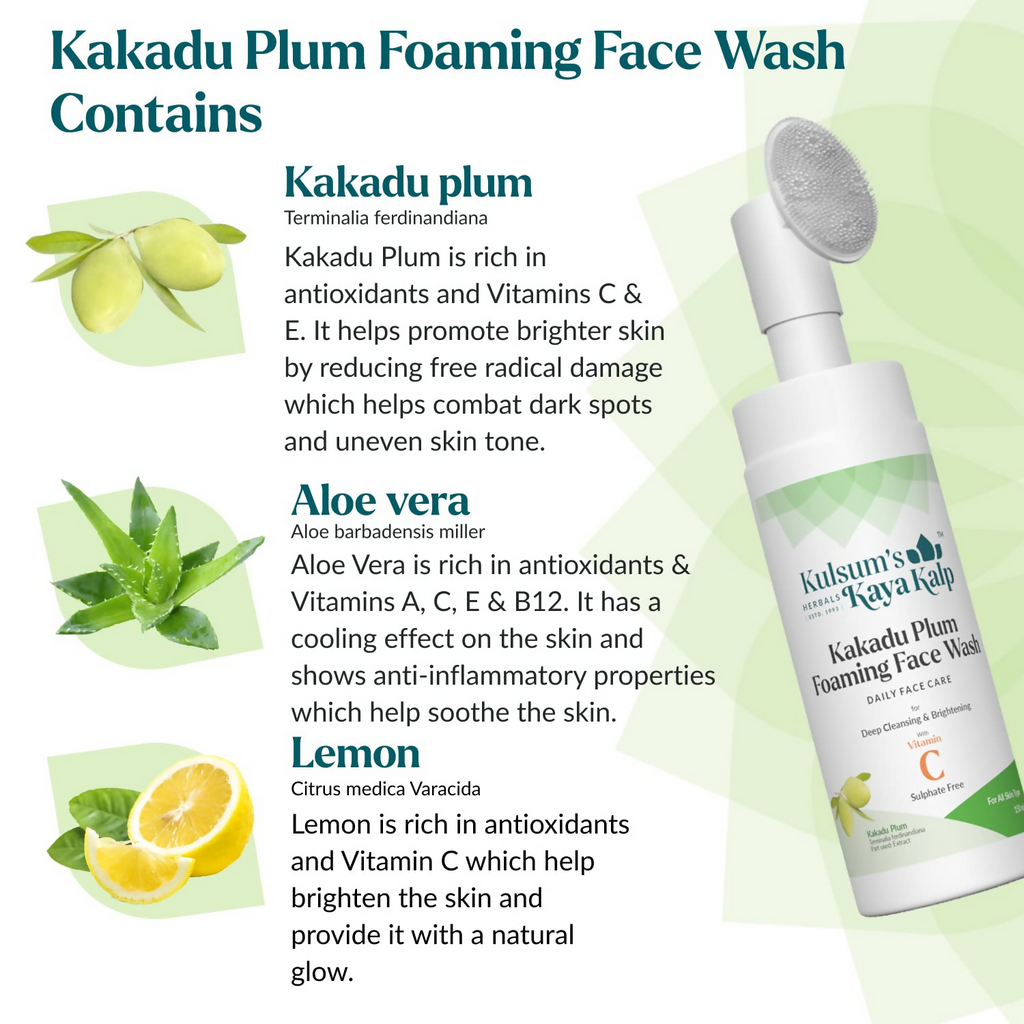 phrase: Kulsum’s Kaya Kalp Kakadu Plum Foaming Face Wash For Deep Cleansing & Brightening About The Product: Kulsum’s Kaya Kalp Kakadu Plum Foaming Face Wash is a highly effective cleanser that strips away the impurities and leaves the skin thoroughly cleansed and nourished. This face cleanser includes the goodness of Kakadu plum extract, lemon, Vitamin C, aloe vera, turmeric, and mulethi