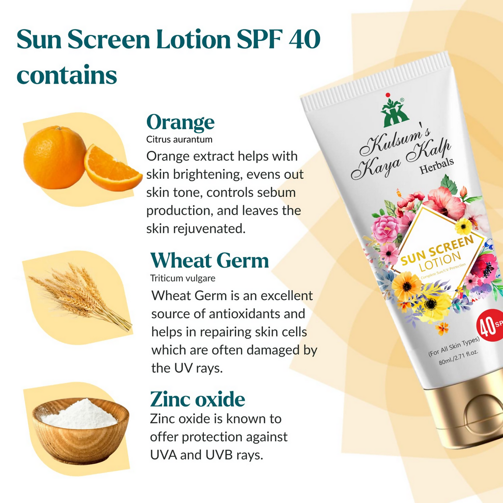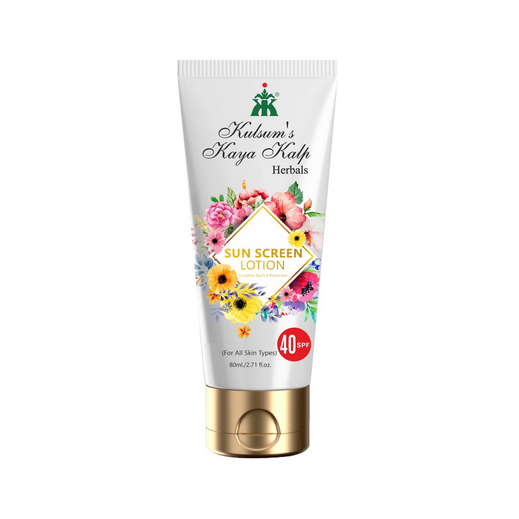 Paraphrase: Kulsum's Kaya Kalp Sun Screen Lotion SPF 40 About The Product Kulsum's Kaya Kalp Sun Screen Lotion SPF 40 About The Product Kulsum's Kaya Kalp Sun Screen Lotion SPF 40 is formulated with hydrating ingredients that also offer antioxidant protection Enriched with the goodness of aloe vera, cucumber extract, and orange extract to offer sun protection and hydrate the skin.