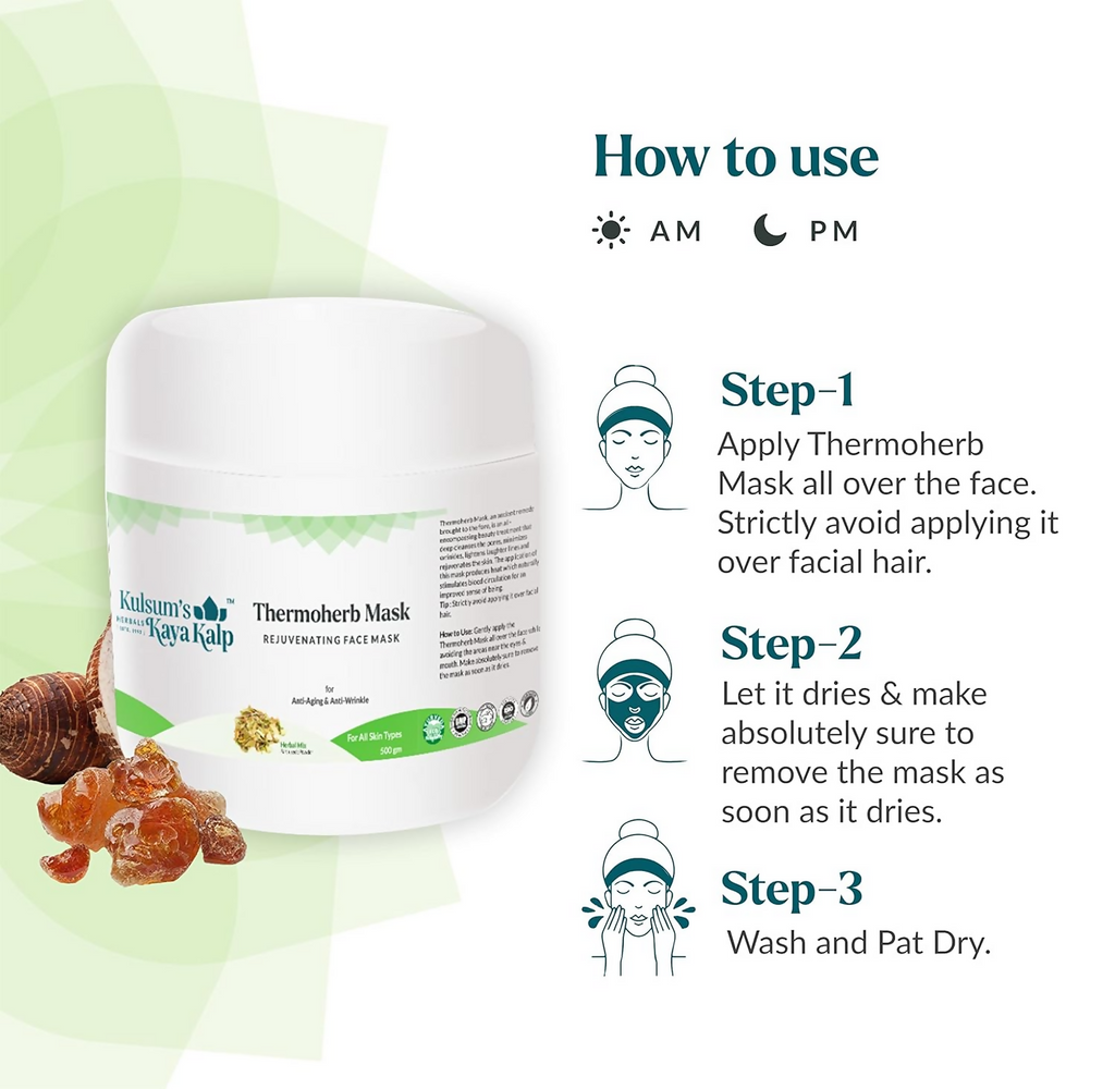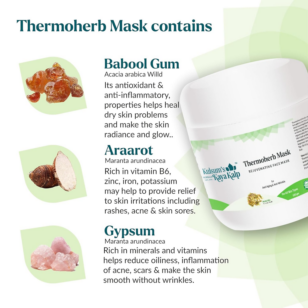 phrase: Kulsum's Kaya Kalp Herbals Thermoherb Mask For Anti-Aging & Anti-wrinkle About The Product: Kulsum's Kaya Kalp Thermoherb Mask is a rejuvenating face mask enriched with Babool Gum, Araarot, and Gypsum. his face mask helps lighten laughter lines, minimize wrinkles, and stimulate blood circulation.