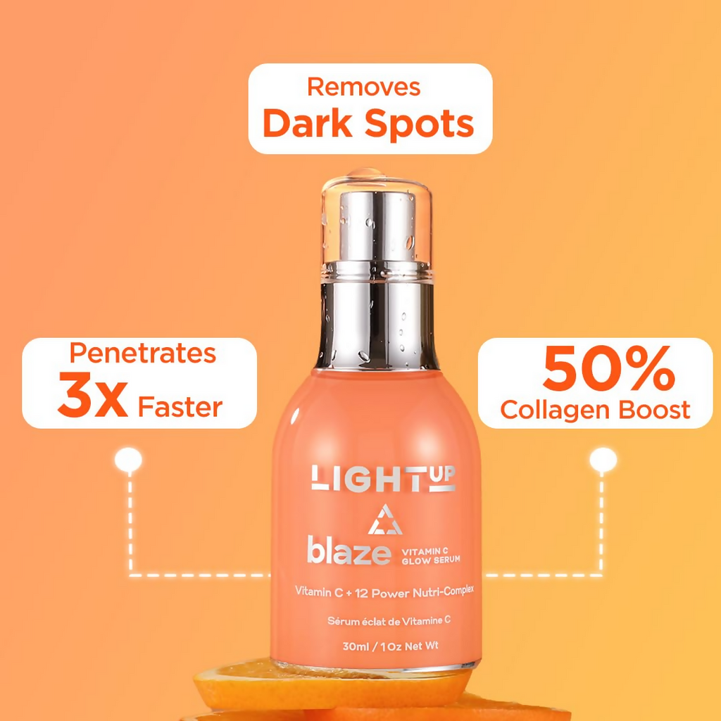 phrase: Light Up Blaze Vitamin C Glow Face Serum About The Product: Spot correcting + reduces hyperpigmentation: the gold standard of vitamin C, the ascorbate penetrates 3x faster than traditional vitamin c. Alpha-arbutin reduces blemishes, spots, and acne. Chinese ginger infuses 40 anti-oxidants that eradicate age spots to promote a luminous glow. Beetroot showers vitamin c that reduces melanin production.