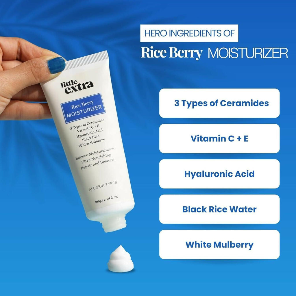 phrase:: Little Extra Rice Berry Face Moisturizer, Lightweight & Non-Sticky for Glowing Skin, Brightening Description: Our Rice Berry face moisturizer is specially formulated to repair, restore, and strengthen your skin’s protective barrier while providing long-lasting moisture. enriched with 3 types of ceramides and hyaluronic acid, it brightens, nourishes, and promotes healthy skin.