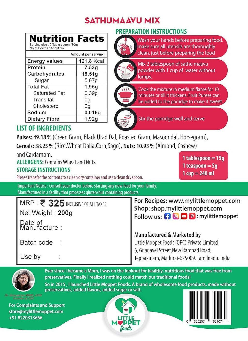 Paraphrase: Little Moppet Foods Sathumaavu Mix for Babies - Free from Added Salt and Sugar with 13 Ingredients Description: Best solid food for weight gain as well as brain and body development. Highly nutritious fiber rich and easily digestible. Energy giving and most filling diet. It is made with top-quality ingredients and under strict hygienic conditions.