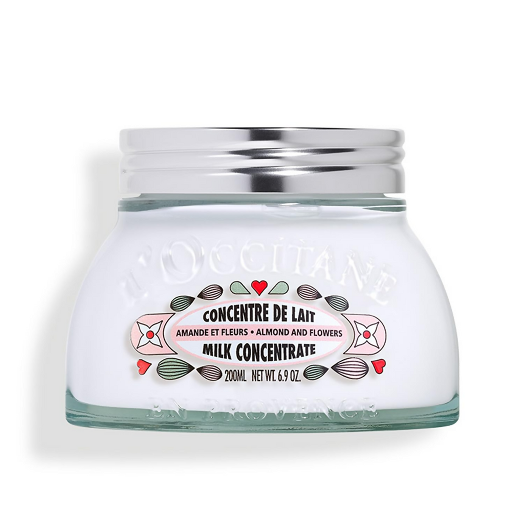 phrase: L'Occitane Almond & Flowers Milk Concentrate Paraphrase: L'Occitane Almond & Flowers Milk Concentrate About the product: The Almond Milk Concentrate delivers long-lasting hydration*, improves suppleness, and visibly smoothes the skin leaving a delicious floral gourmand scent.