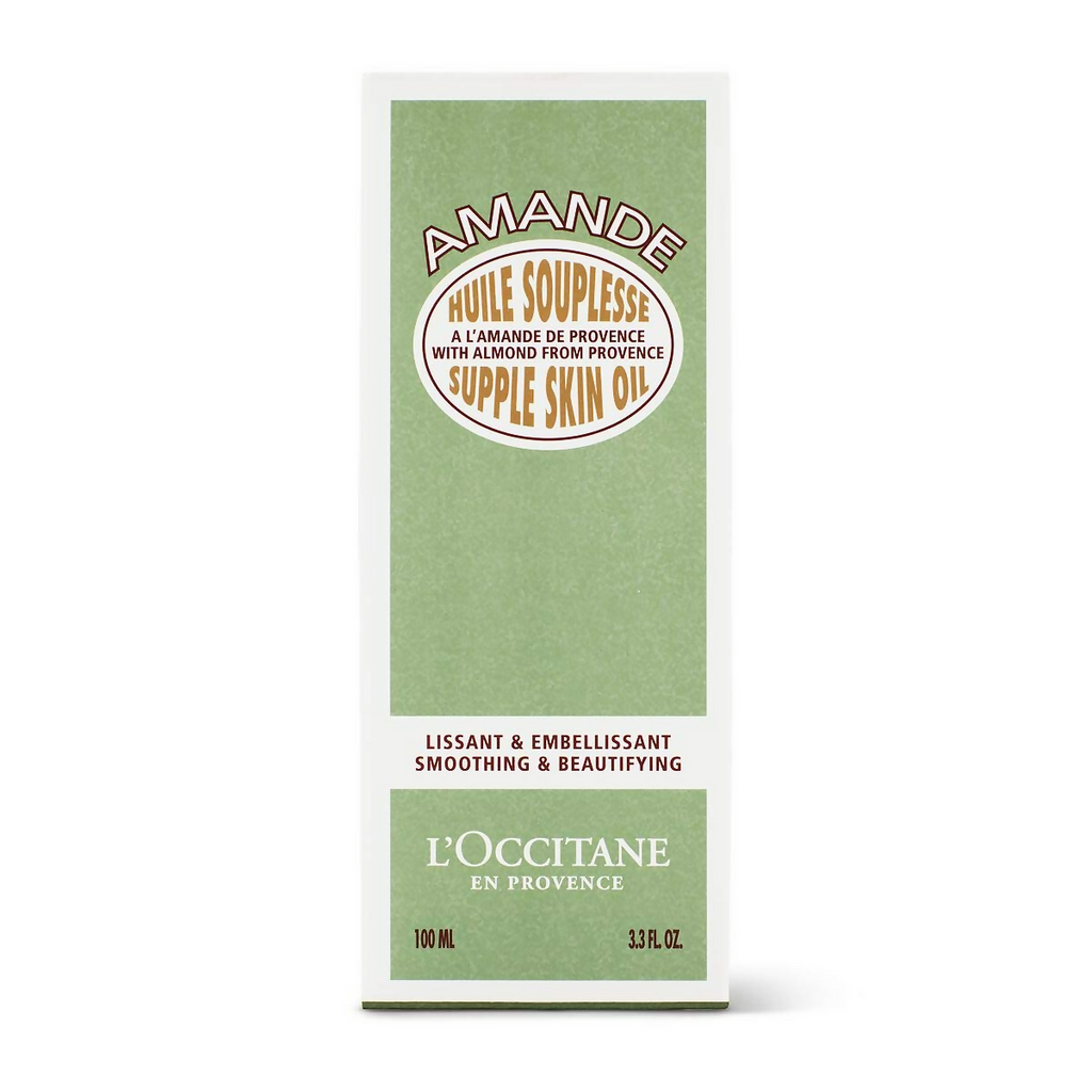 phrase: L'Occitane Almond Supple Skin Oil Ingredients: Sweet Almond Oil Sunflower Oil How to use: Apply on the whole body, massaging into the skin, with upward circular motions. Focus on thighs, buttocks, tummy, and arms. Legal Disclaimer: Product images are for illustrative purposes only. Images/packaging/ labels may vary from time to time due to changes made by the manufacturer's manufacturing batch and location.