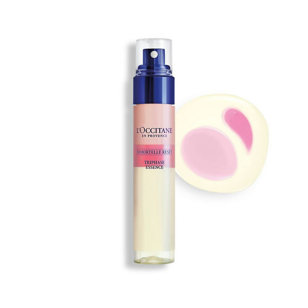 phrase: L'Occitane Immortelle Reset Triphase Anti-Aging Essence Mini How to use: Spray a minimum of 3 doses in the palm of your hand and pat the product on your face for better penetration. Spray a minimum of 3 doses directly on your face, eyes closed. Lay for a 2-minute break with your 100% cotton eco sheet mask (reusable, rewashable, removable): let it soak in warm water and then apply it on your face to seal in the