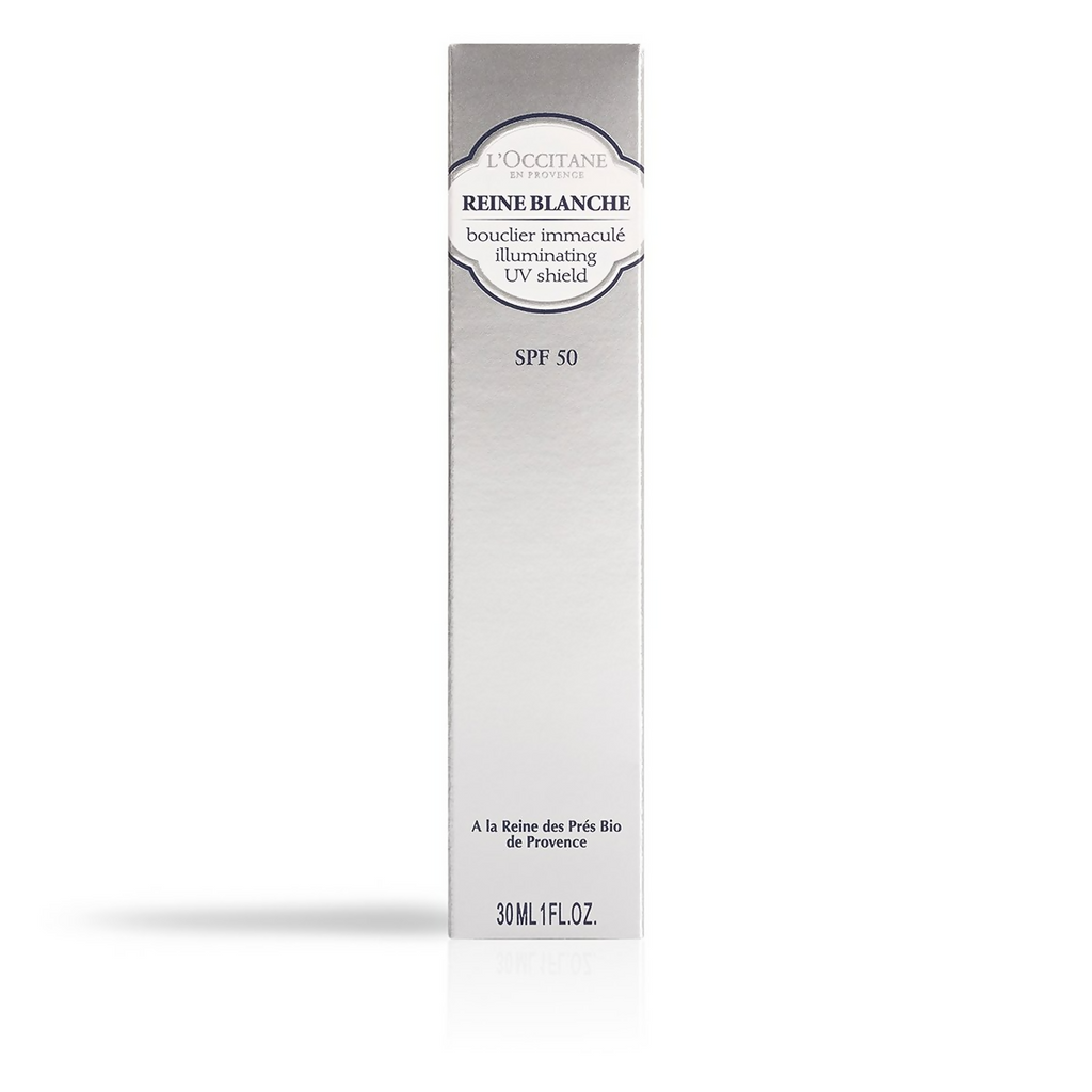 : L'Occitane Reine Blanche Brightening UV Shield Spf 50 About The Product: Enriched with complex of natural-origin ingredients, this serum tones up the skin’s luminosity. it helps clear the dullness & unevenness, induced by external aggressions.
