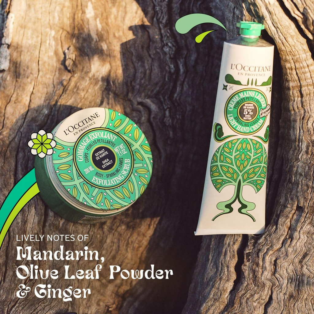 phrase: L'Occitane Shea Exfoliating Body Scrub About the product: Enriched with Shea and olive tree leaves, this scrub and its delicious texture gently exfoliates the skin and leaves it smooth and silky. The skin is perfumed with a scent inspired by a walk in the provencal olive tree fields, combining fresh and sparkling notes of olive tree leaves and fruits.