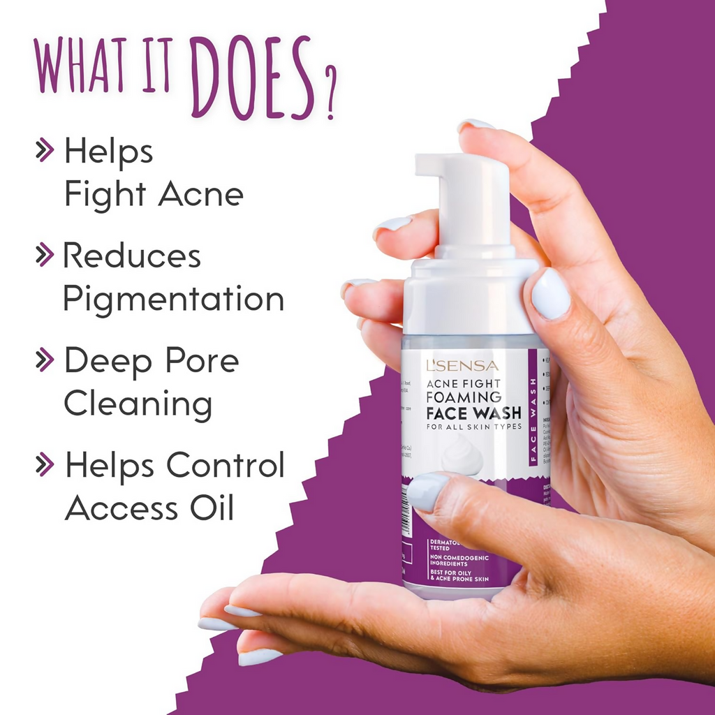 phrase: L'SENSA foam face wash helps reduce acne and pimples by cleaning dead cells, pores, and uneven skin. IMPROVES SKIN TONE & REDUCES ACNE MARKS : Our face wash deeply cleanses dirt and excess oil while simultaneously hydrating your skin.
