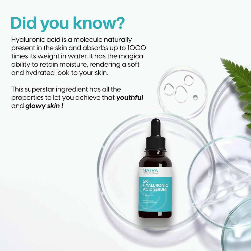 phrase:: Matra 5% Hyaluronic Acid Serum For Skin Hydration, Anti-Aging & Glowing Skin Ingredients : Hyaluronic Acid: It retains moisture, rendering a soft and hydrated look to your skin. It has all the properties to let you achieve that youthful and glowy skin. Panthenol: It moisturizes the skin by attracting eater from the environment, this keeps skin dewy and hydrated. It allows moisture to penetrate deep inside the skin.